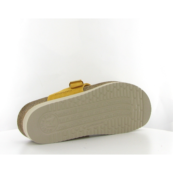 Nu pieds légerement compensés jaune à bride et entre doigts, qui chaussent normalement;